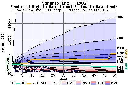 The high to date and low to date prices of the stock plotted against a random walk model for 1985 (what's this?).