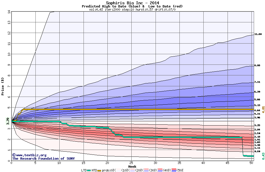 The high to date and low to date prices of the stock plotted against a random walk model for 2014 (what's this?).