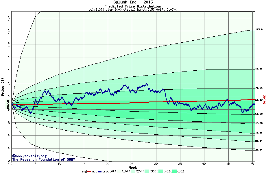 The following graph plots the year-to-date performance of the stock for 2015 compared to the probability calculated by a random walk model.