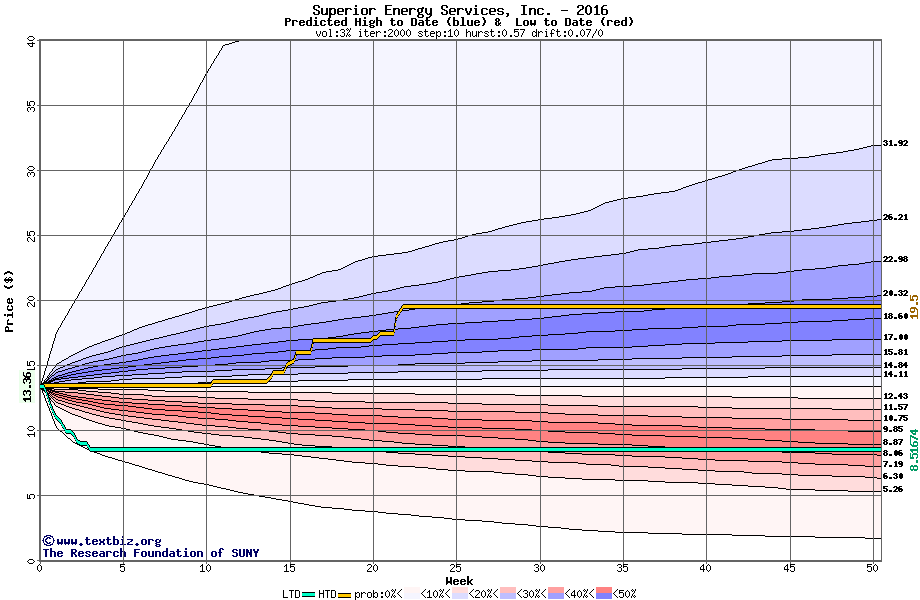 The high to date and low to date prices of the stock plotted against a random walk model for 2016 (what's this?).