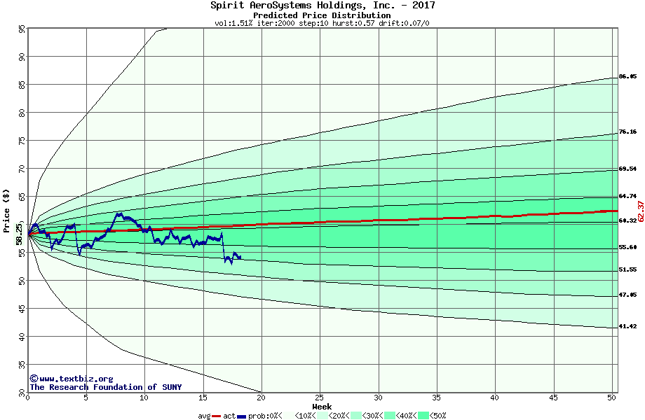 The following graph plots the year-to-date performance of the stock for 2017 compared to the probability calculated by a random walk model.