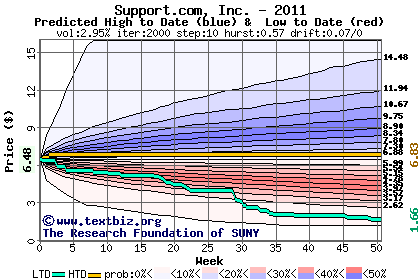The high to date and low to date prices of the stock plotted against a random walk model for 2011 (what's this?).