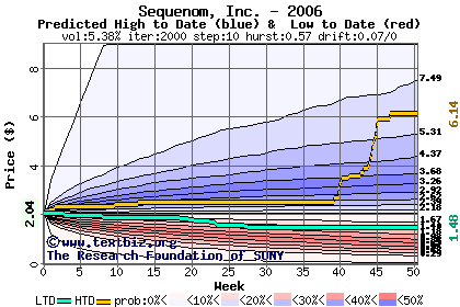 The high to date and low to date prices of the stock plotted against a random walk model for 2006 (what's this?).