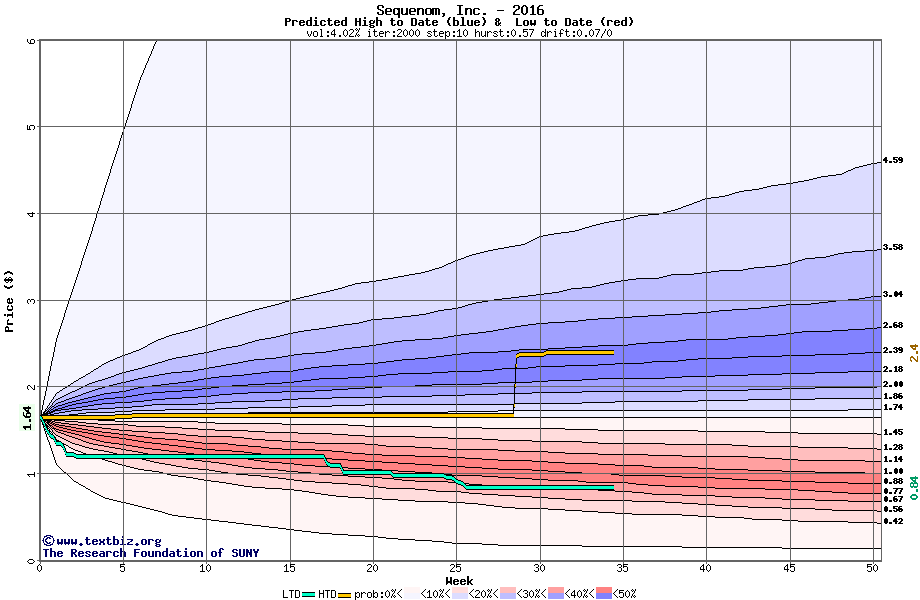 The high to date and low to date prices of the stock plotted against a random walk model for 2016 (what's this?).