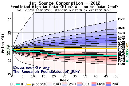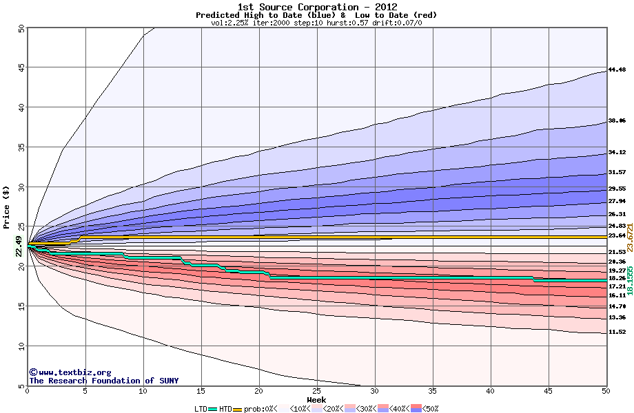 The high to date and low to date prices of the stock plotted against a random walk model for 2012 (what's this?).