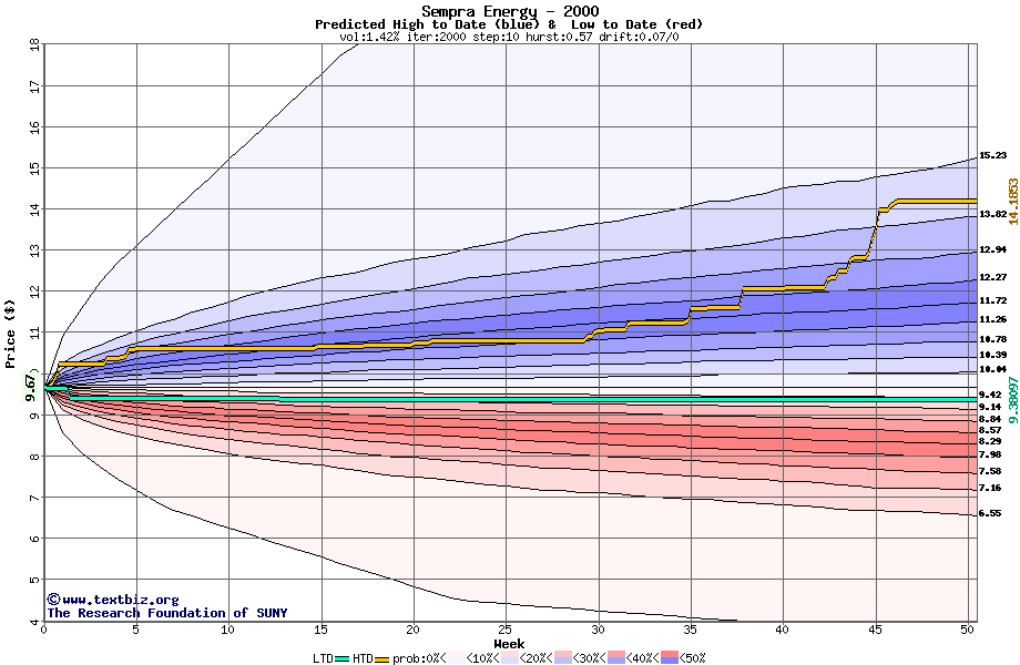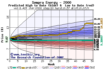 The high to date and low to date prices of the stock plotted against a random walk model for 2000 (what's this?).