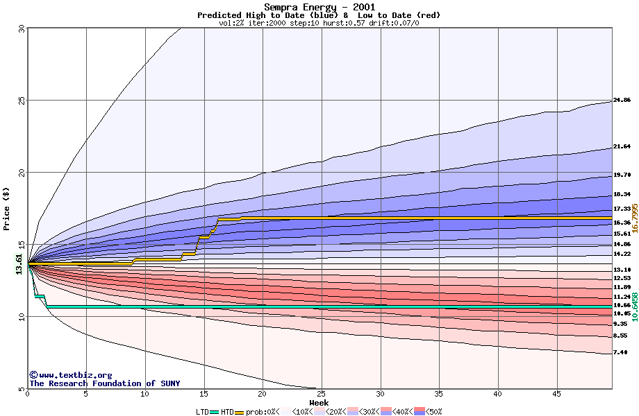 The high to date and low to date prices of the stock plotted against a random walk model for 2001 (what's this?).