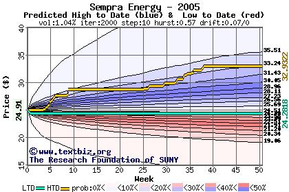 The following graph plots the year-to-date performance of the stock for 2005 compared to the probability calculated by a random walk model.