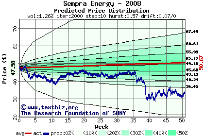 The following graph plots the year-to-date performance of the stock for 2008 compared to the probability calculated by a random walk model.