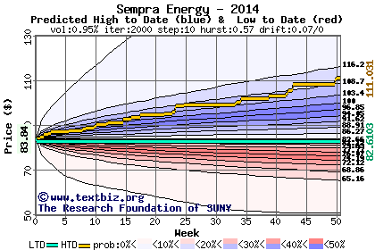 The high to date and low to date prices of the stock plotted against a random walk model for 2014 (what's this?).
