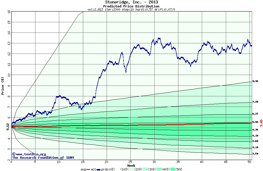 The following graph plots the year-to-date performance of the stock for 2013 compared to the probability calculated by a random walk model.