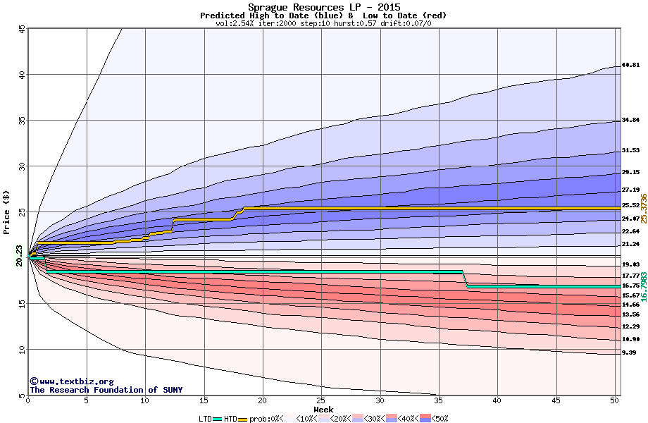 The high to date and low to date prices of the stock plotted against a random walk model for 2015 (what's this?).