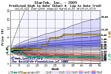 The high to date and low to date prices of the stock plotted against a random walk model for 2009 (what's this?).