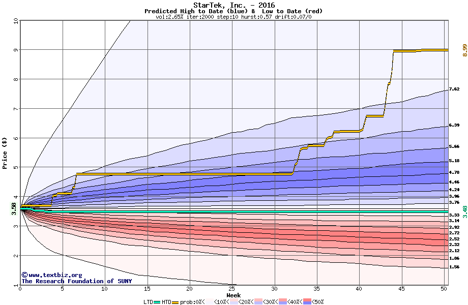 The high to date and low to date prices of the stock plotted against a random walk model for 2016 (what's this?).