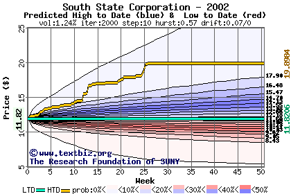 The high to date and low to date prices of the stock plotted against a random walk model for 2002 (what's this?).