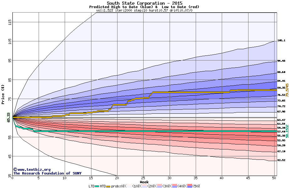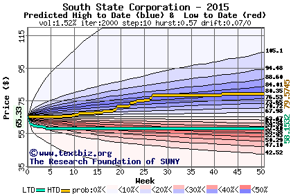 The high to date and low to date prices of the stock plotted against a random walk model for 2015 (what's this?).