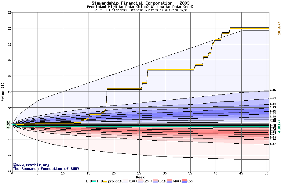 The high to date and low to date prices of the stock plotted against a random walk model for 2003 (what's this?).