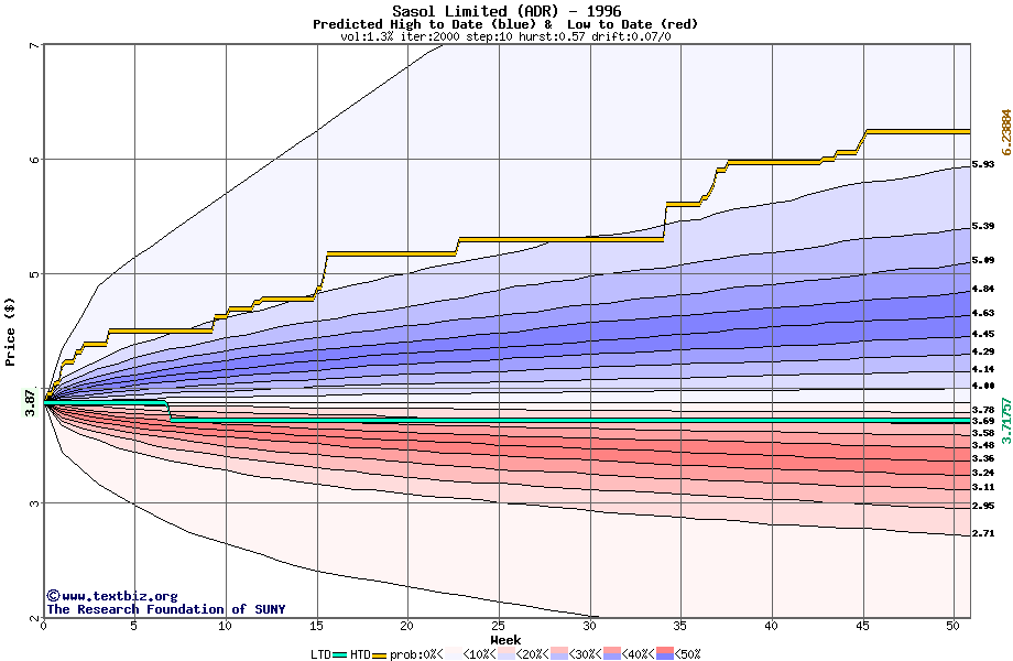 The high to date and low to date prices of the stock plotted against a random walk model for 1996 (what's this?).