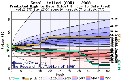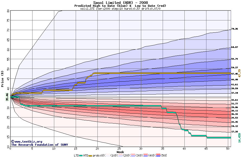 The high to date and low to date prices of the stock plotted against a random walk model for 2008 (what's this?).