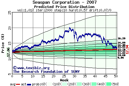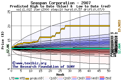 The high to date and low to date prices of the stock plotted against a random walk model for 2007 (what's this?).