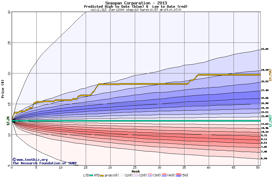 The high to date and low to date prices of the stock plotted against a random walk model for 2013 (what's this?).