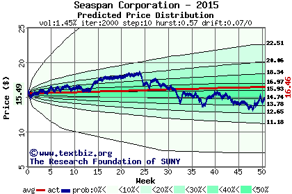 The high to date and low to date prices of the stock plotted against a random walk model for 2015 (what's this?).