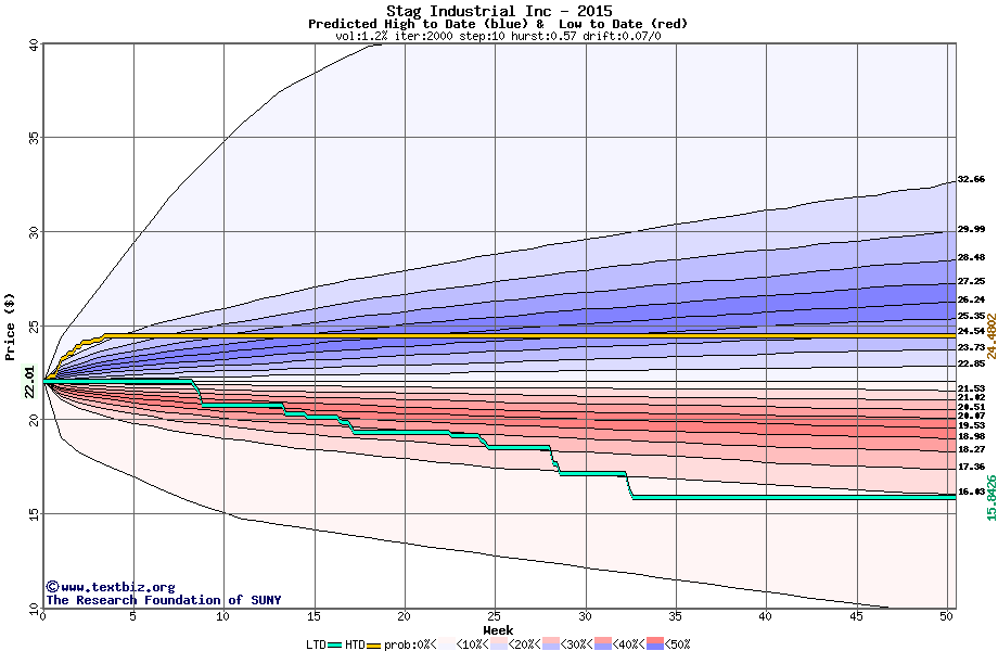 The following graph plots the year-to-date performance of the stock for 2015 compared to the probability calculated by a random walk model.