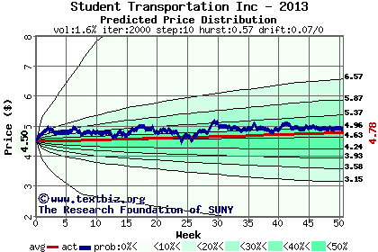 The high to date and low to date prices of the stock plotted against a random walk model for 2013 (what's this?).