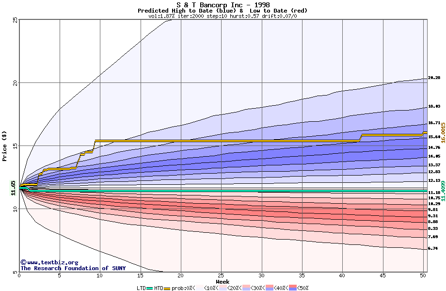 The high to date and low to date prices of the stock plotted against a random walk model for 1998 (what's this?).