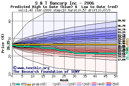 The high to date and low to date prices of the stock plotted against a random walk model for 2006 (what's this?).