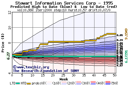 The high to date and low to date prices of the stock plotted against a random walk model for 1995 (what's this?).