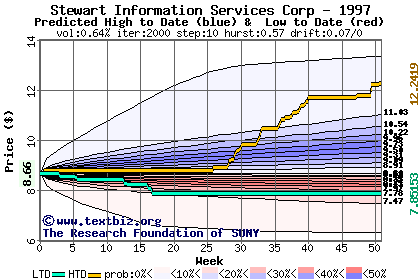 The high to date and low to date prices of the stock plotted against a random walk model for 1997 (what's this?).