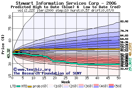 The high to date and low to date prices of the stock plotted against a random walk model for 2006 (what's this?).