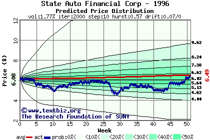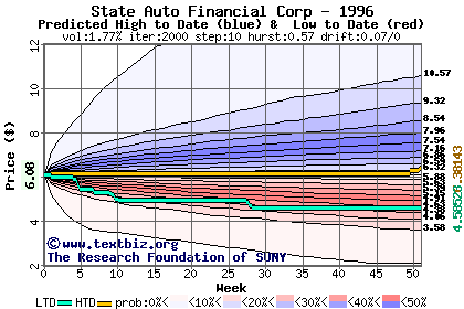 The high to date and low to date prices of the stock plotted against a random walk model for 1996 (what's this?).