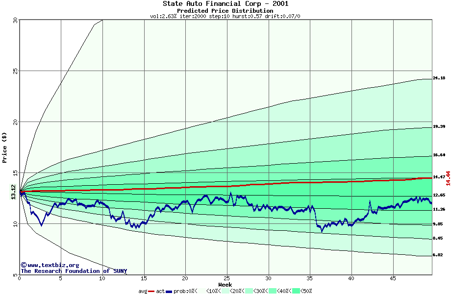 The following graph plots the year-to-date performance of the stock for 2001 compared to the probability calculated by a random walk model.