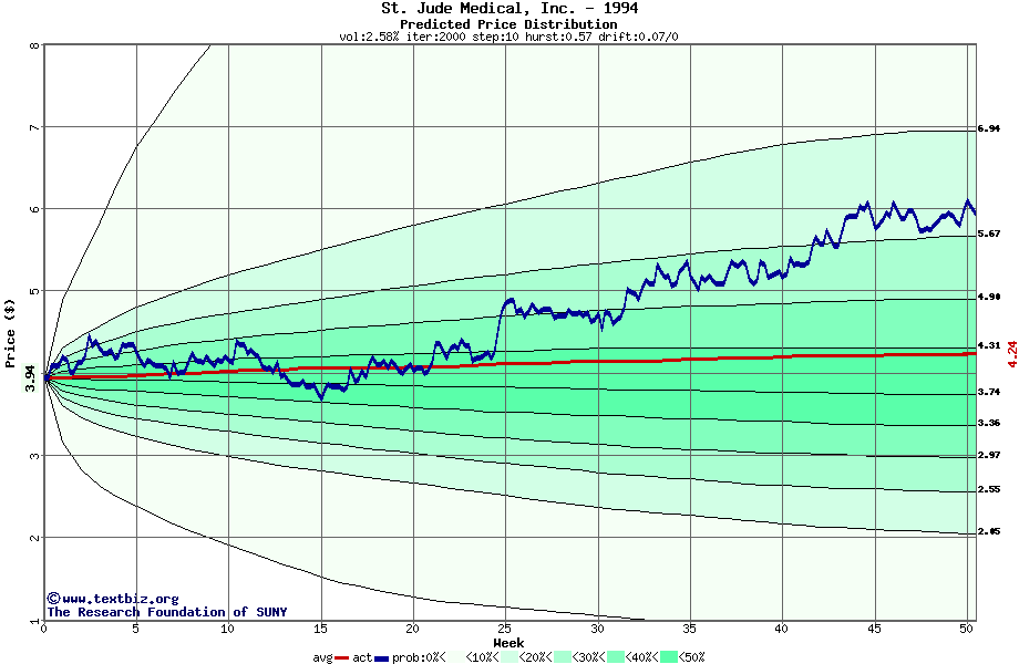 The following graph plots the year-to-date performance of the stock for 1994 compared to the probability calculated by a random walk model.