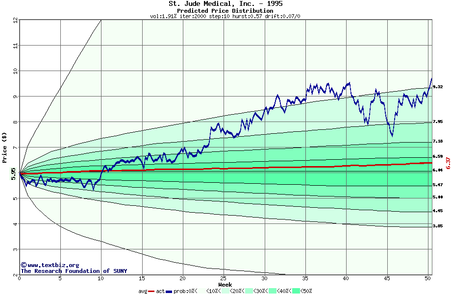 The following graph plots the year-to-date performance of the stock for 1995 compared to the probability calculated by a random walk model.