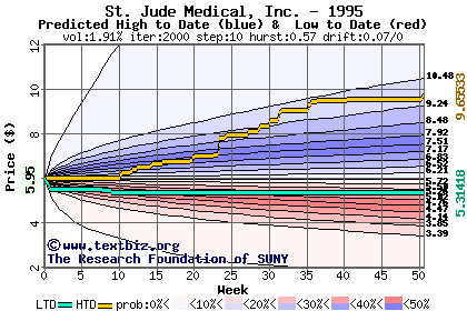 The high to date and low to date prices of the stock plotted against a random walk model for 1995 (what's this?).