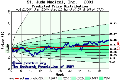 The following graph plots the year-to-date performance of the stock for 2001 compared to the probability calculated by a random walk model.