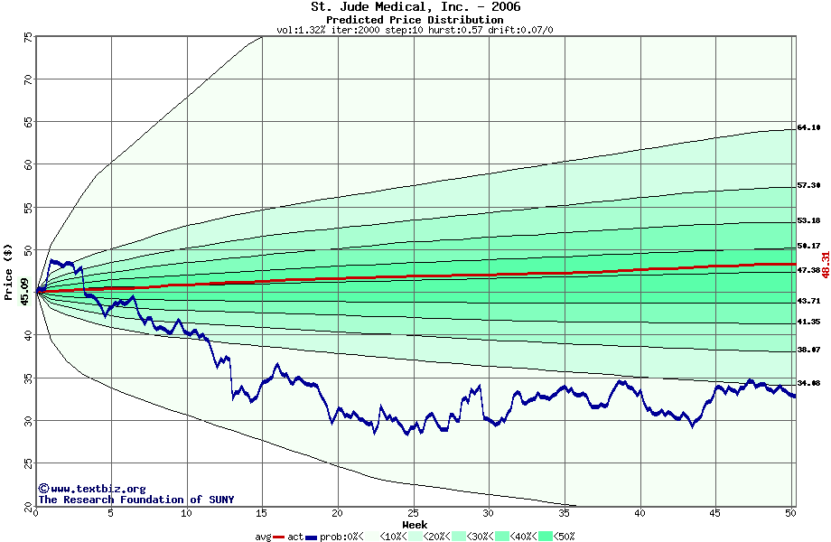The following graph plots the year-to-date performance of the stock for 2006 compared to the probability calculated by a random walk model.