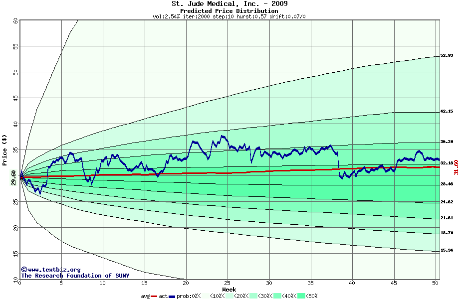 The following graph plots the year-to-date performance of the stock for 2009 compared to the probability calculated by a random walk model.