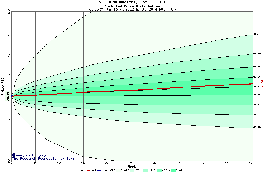 The following graph plots the year-to-date performance of the stock for 2017 compared to the probability calculated by a random walk model.