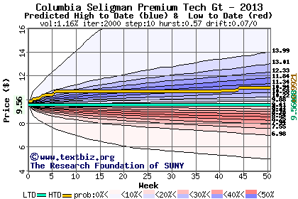 The high to date and low to date prices of the stock plotted against a random walk model for 2013 (what's this?).