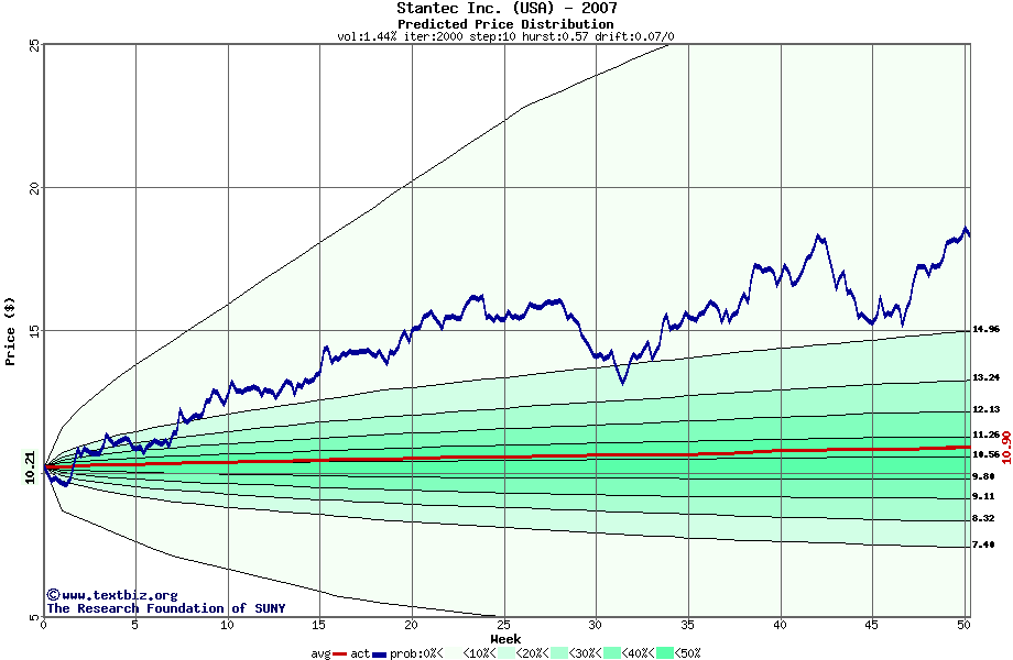The following graph plots the year-to-date performance of the stock for 2007 compared to the probability calculated by a random walk model.
