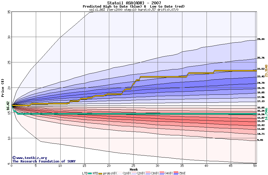 The high to date and low to date prices of the stock plotted against a random walk model for 2007 (what's this?).