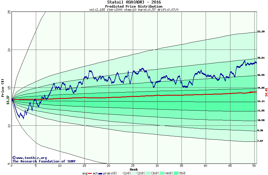 The following graph plots the year-to-date performance of the stock for 2016 compared to the probability calculated by a random walk model.