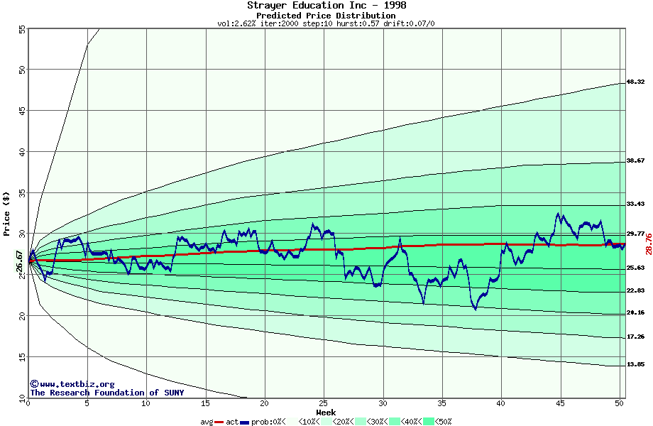 The following graph plots the year-to-date performance of the stock for 1998 compared to the probability calculated by a random walk model.