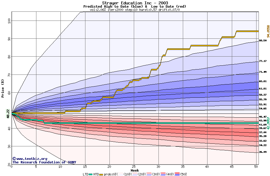 The following graph plots the year-to-date performance of the stock for 2003 compared to the probability calculated by a random walk model.