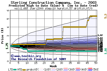 The high to date and low to date prices of the stock plotted against a random walk model for 2003 (what's this?).