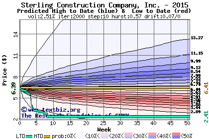 The high to date and low to date prices of the stock plotted against a random walk model for 2015 (what's this?).